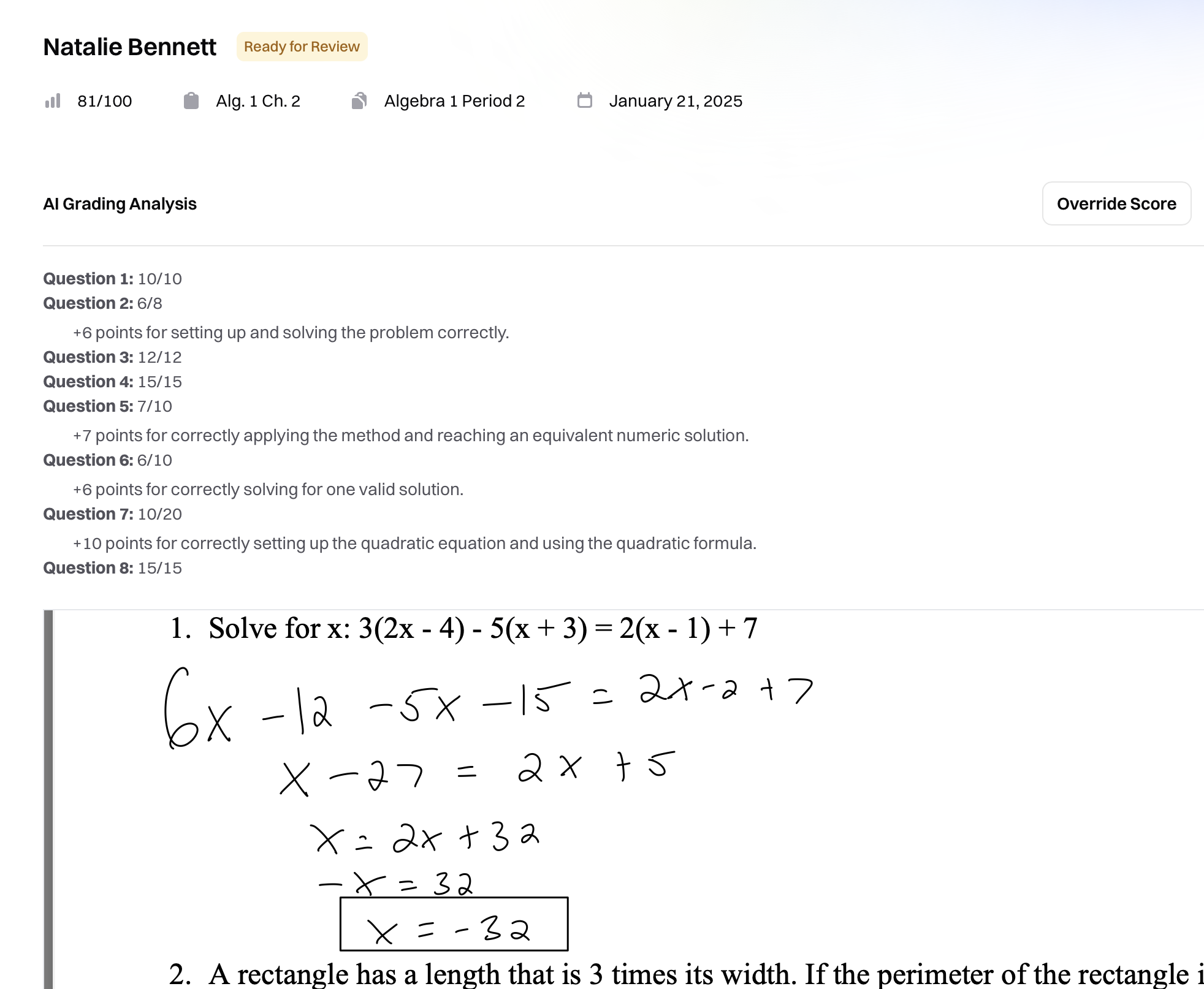 While we're continually improving accuracy, our benchmarks show that the system is approximately 95% accurate, assuming the student has legible handwriting. You can review and adjust scores manually if needed to ensure the highest level of precision.